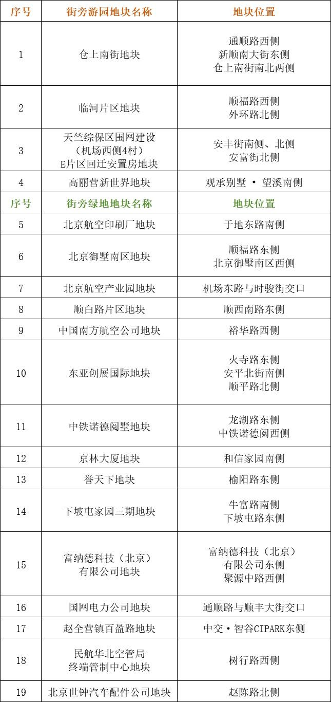 根据规划与地块周边功能需求,19处地块涉及仁和镇、高丽营镇等10个属地,总面积达20.34万平方米。19处地块分为街旁游园、街旁绿地两种类型,通过多元增绿、扩大休闲游憩绿地规模进一步提升市民的生活品质。